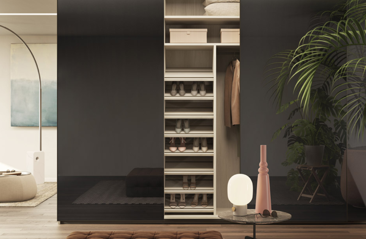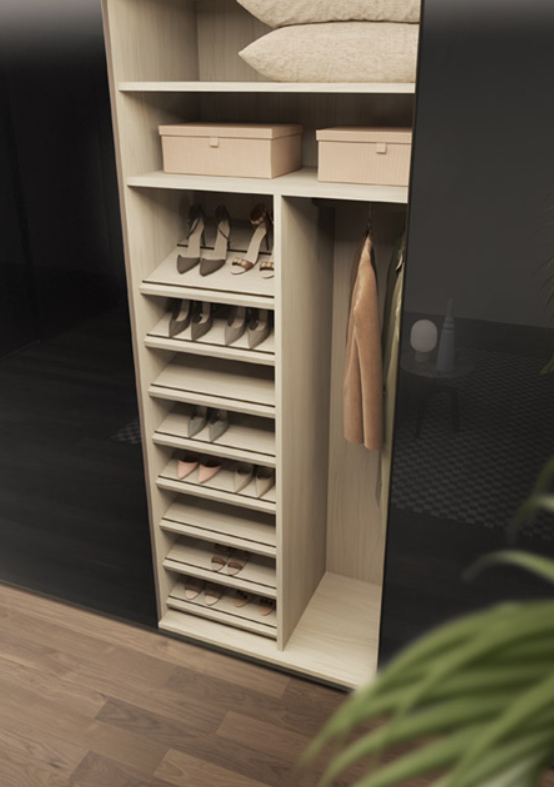 Dettaglio della raffinata scarpiera, inseribile in ogni armadio della collezione “Night Collection Twenty Twenty”: ripiani inclinati adatti ad ogni tipo di calzatura, con profili anticaduta in finitura Titanio. E’ possibile personalizzare il numero di ripiani e la larghezza del vano.